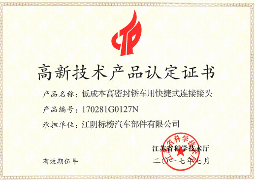 日前,我司低成本高密封轎車(chē)用快捷式連接接頭獲江蘇省科學(xué)技術(shù)廳頒發(fā)的高新技術(shù)產(chǎn)品認(rèn)定證書(shū)。